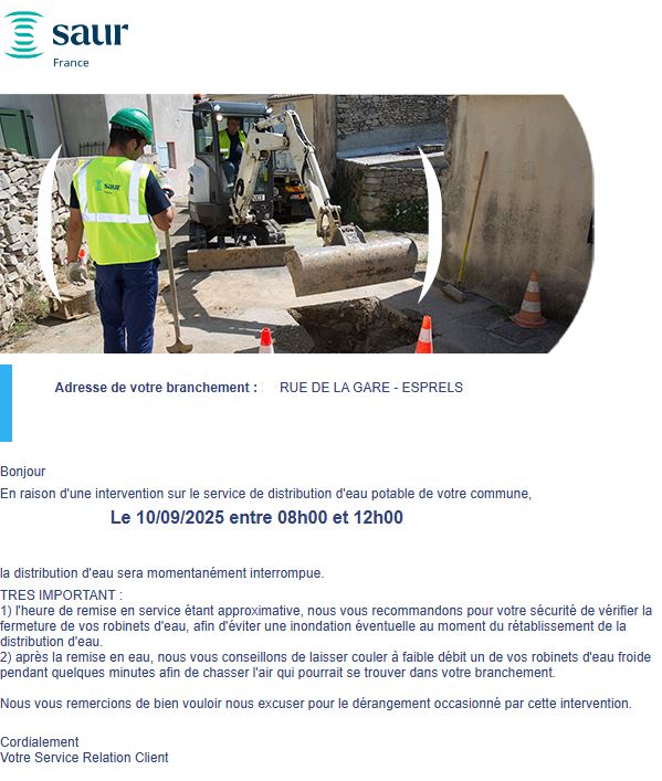 Coupure d'eau Rue de la gare le 10 septembre 2025 entre 08H et 12H